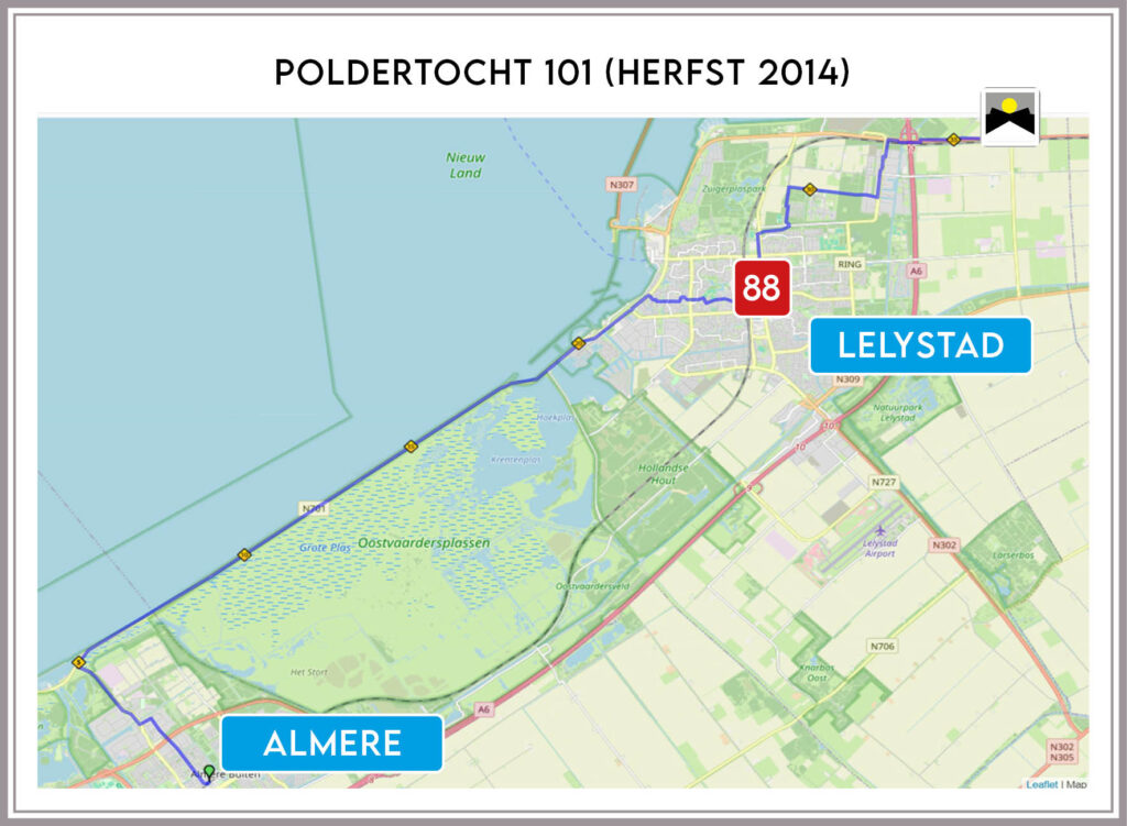Het blijft een wonder dat zelfs na 100 tochten telkens weer nieuwe varianten worden uitgedacht door polderplanner Vellinga. Dit keer verkenden de polderlopers voor het eerst in de lange geschiedenis van het polderlopen de Beginweg. Zigzaggend door de bossen ten noorden van Lelystad passeerden ze het hondencrematorium van Martin Gaus, in de volksmond toepasselijk ‘Gauswitsch’ gedoopt.