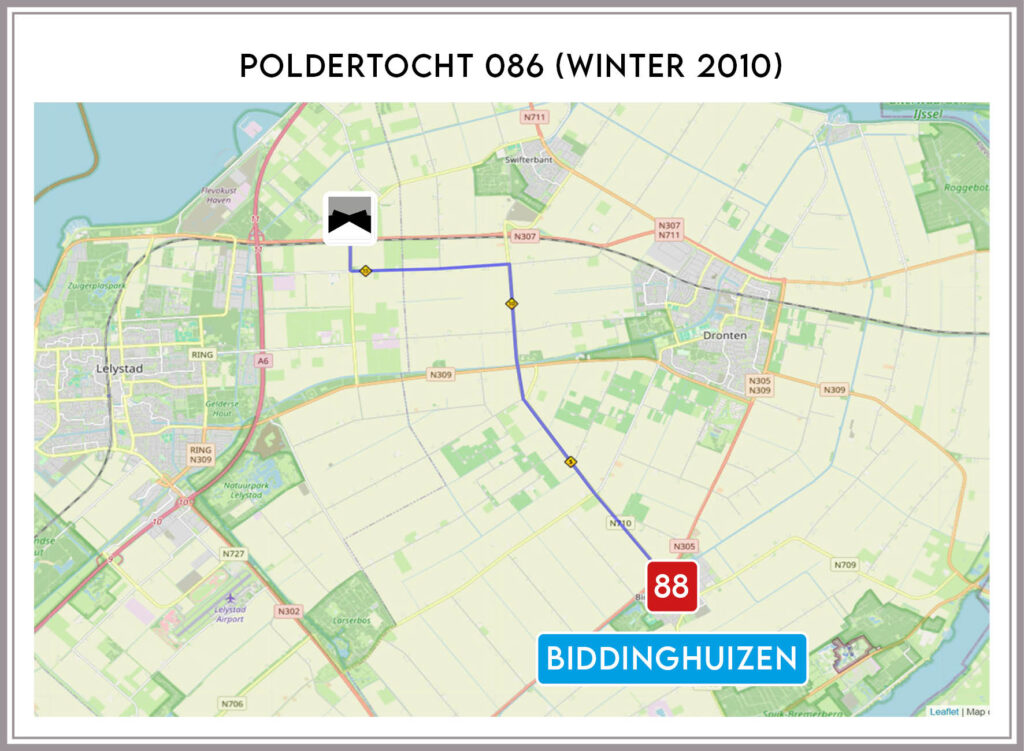 Voor het eerst in de geschiedenis werd er een poldertocht gelopen in de sneeuw. En dan hebben we het over échte sneeuw. De fietspaden langs de Biddingweg waren verdwenen onder een dik pak sneeuw. De polderlopers liepen dan ook over de met zout bestrooide grote weg. Zo nu en dan even in de berm stappend om de argeloze tegenliggers niet de stuipen op het lijft te jagen. Het laatste stuk over de Elandweg was het glibberen geblazen want daar was de strooiwagen niet geweest.